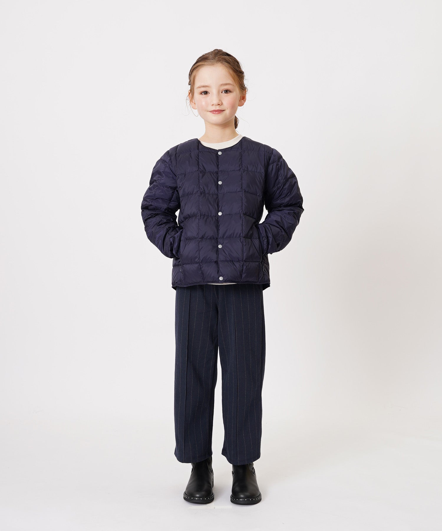 A signature piece from the TAION KIDS LINE, this inner down jacket is thoughtfully designed for easy wear and all-day comfort.