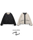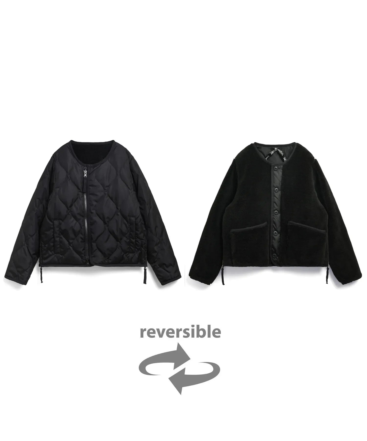 The outer side features warm down with charming onion quilting, while the reverse side uses soft, fluffy boa fleece for added coziness.