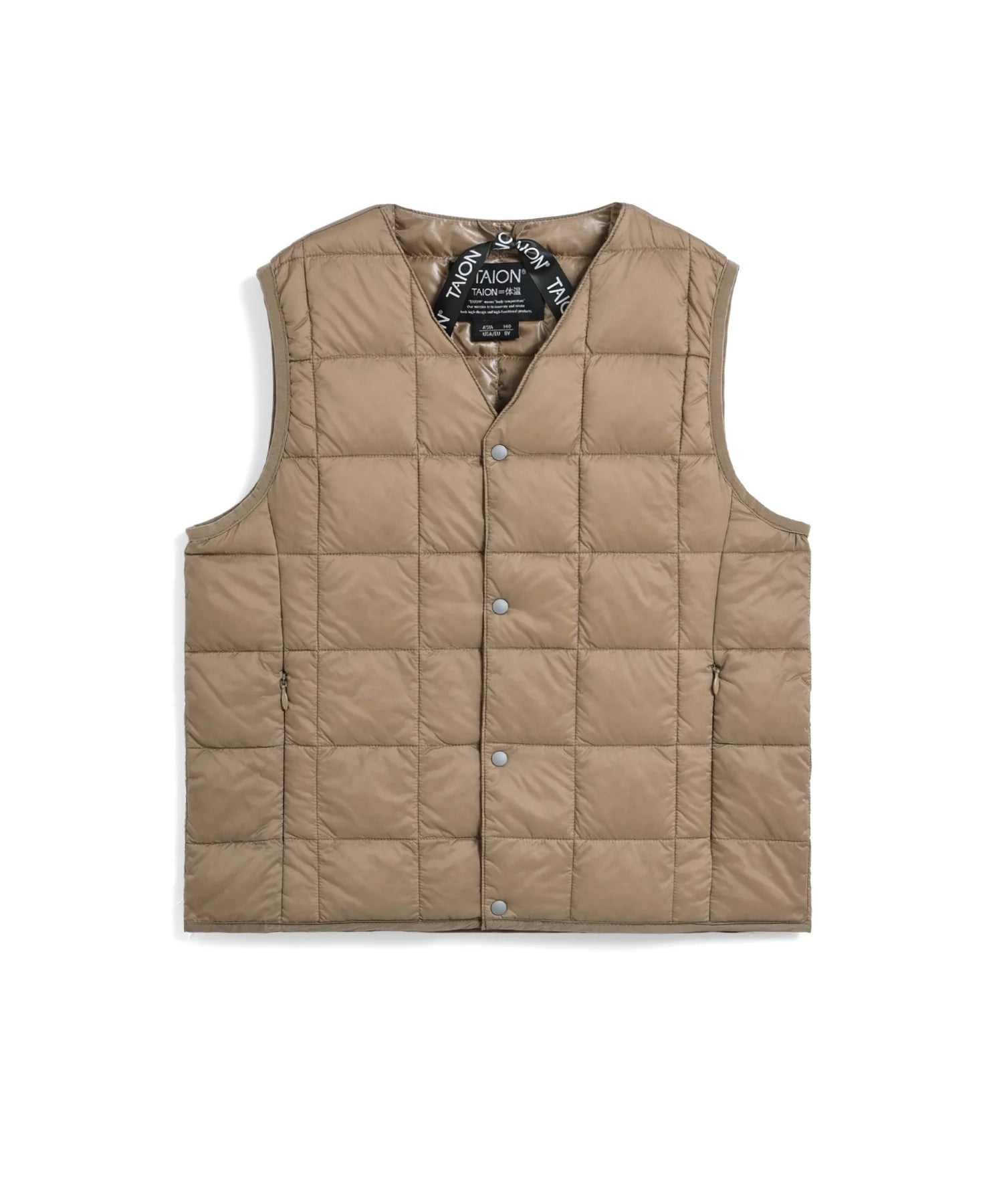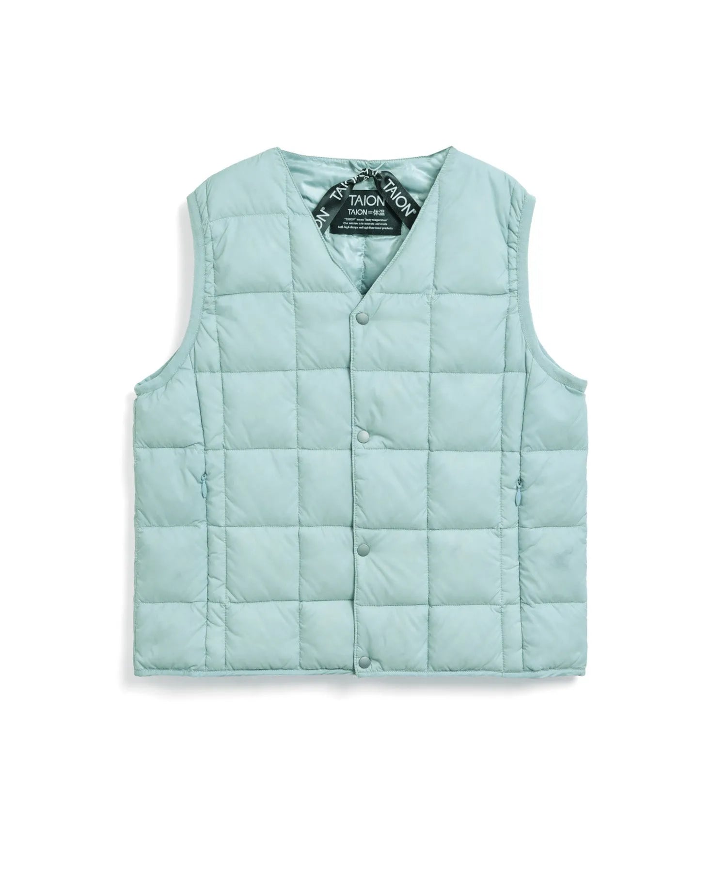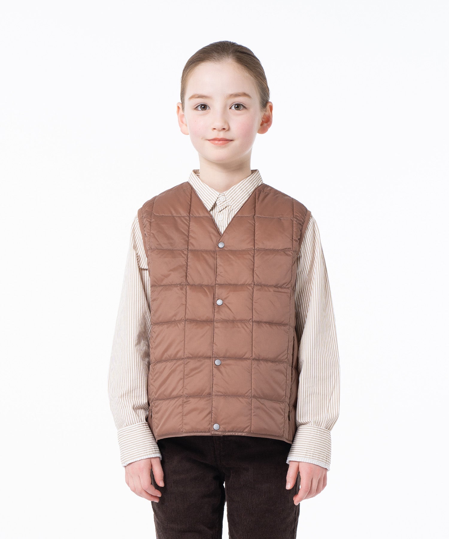 A signature piece from the TAION KIDS LINE, this inner down vest is designed with thoughtful details to make dressing easy and comfortable for children—featuring a front button closure and a neckline that keeps down fill from touching the skin.