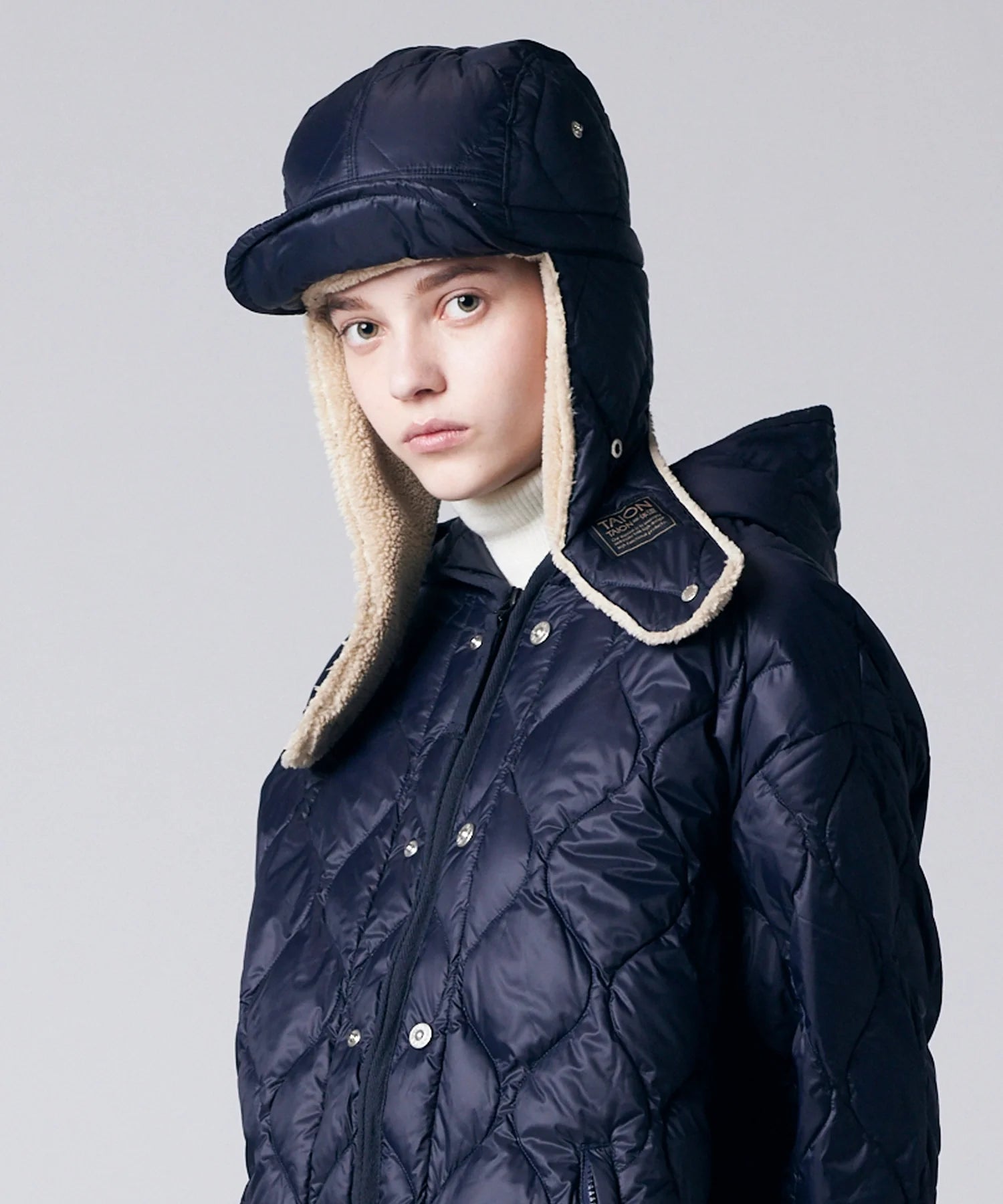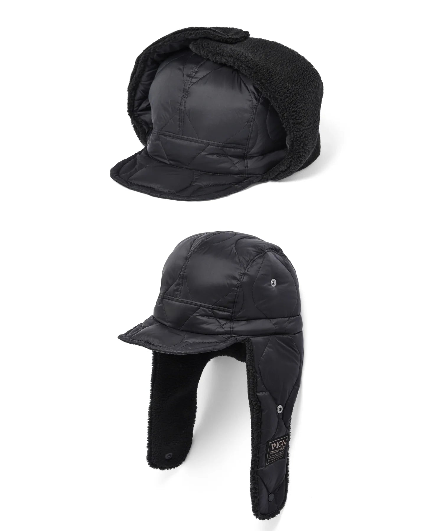 A warm down cap from TAION’s MILITARY LINE, combining the softness of boa fleece with the warmth of down.