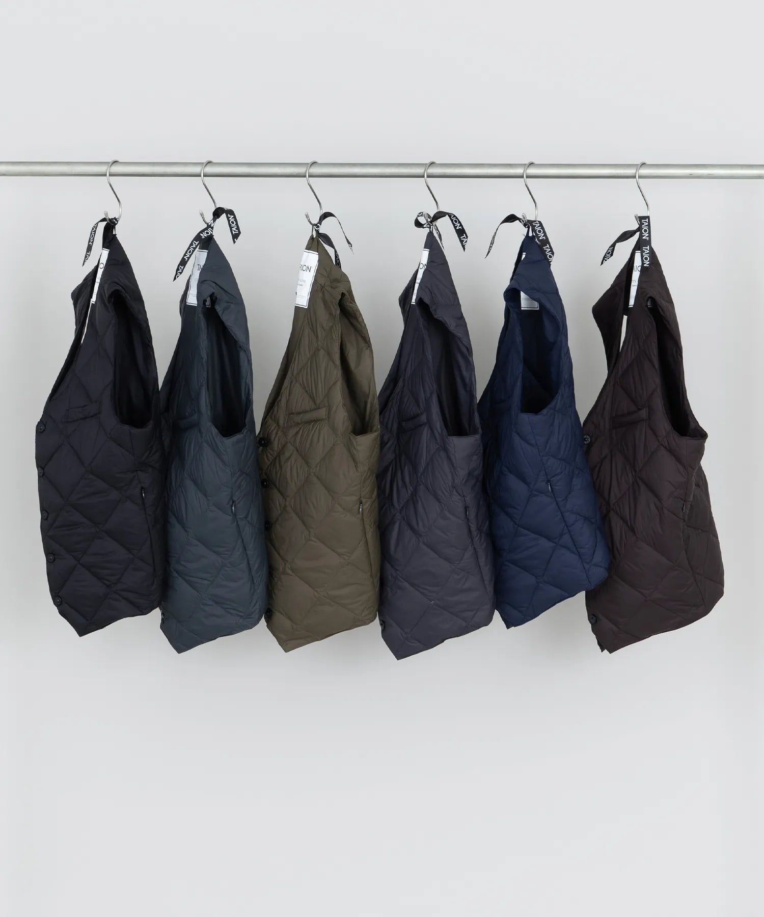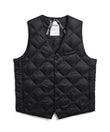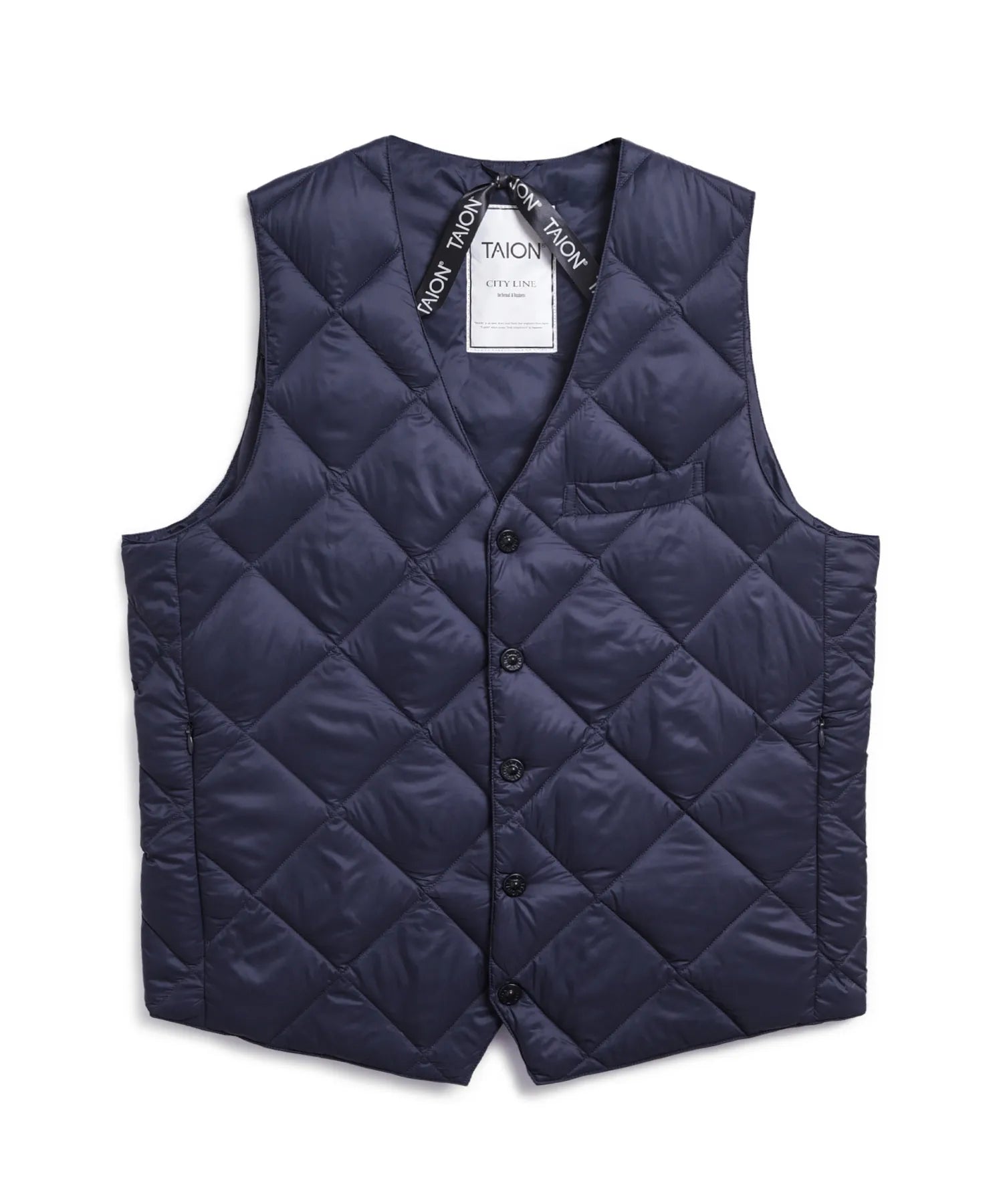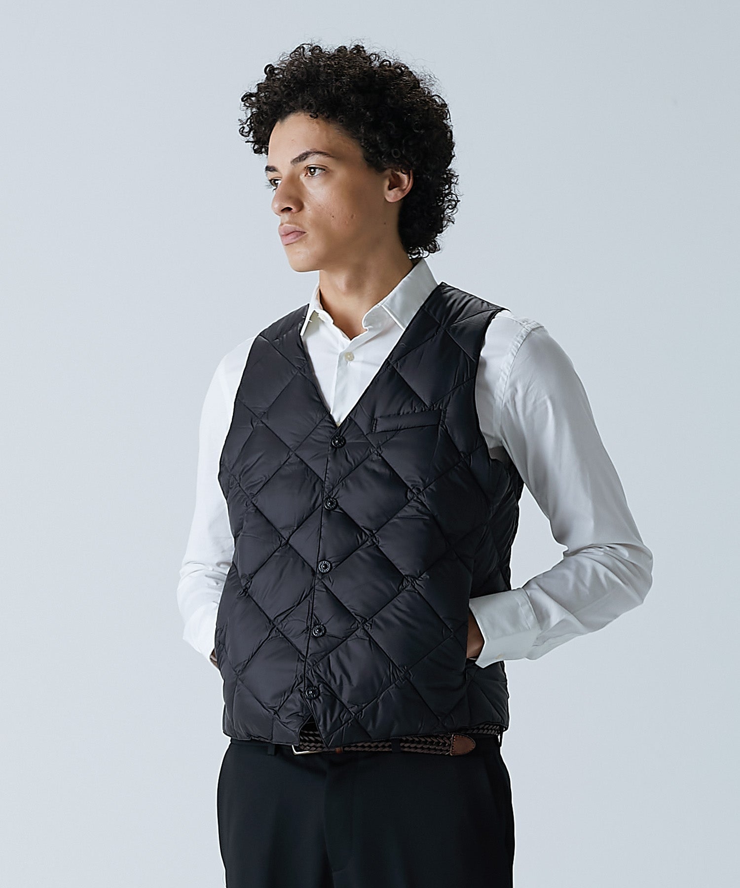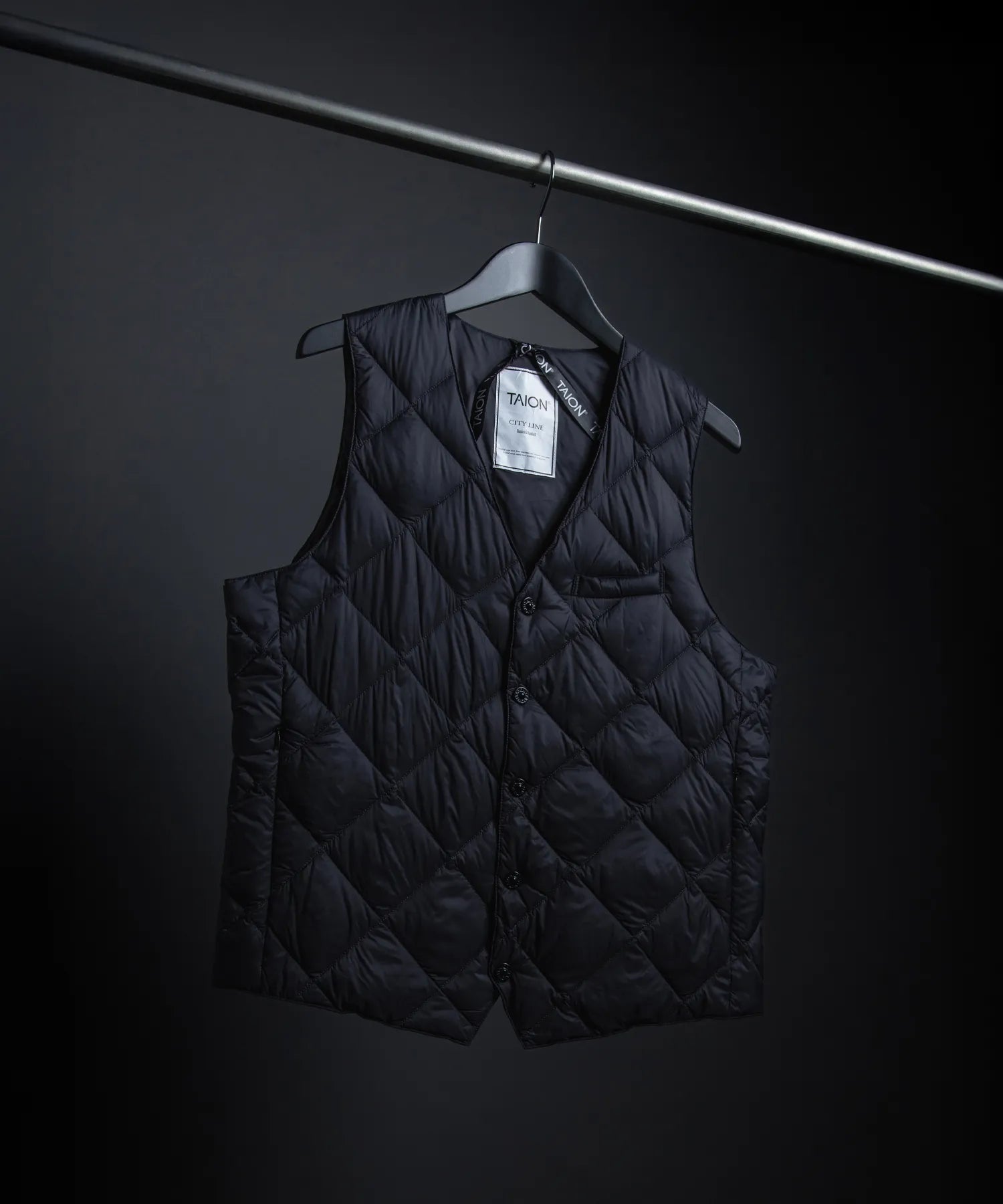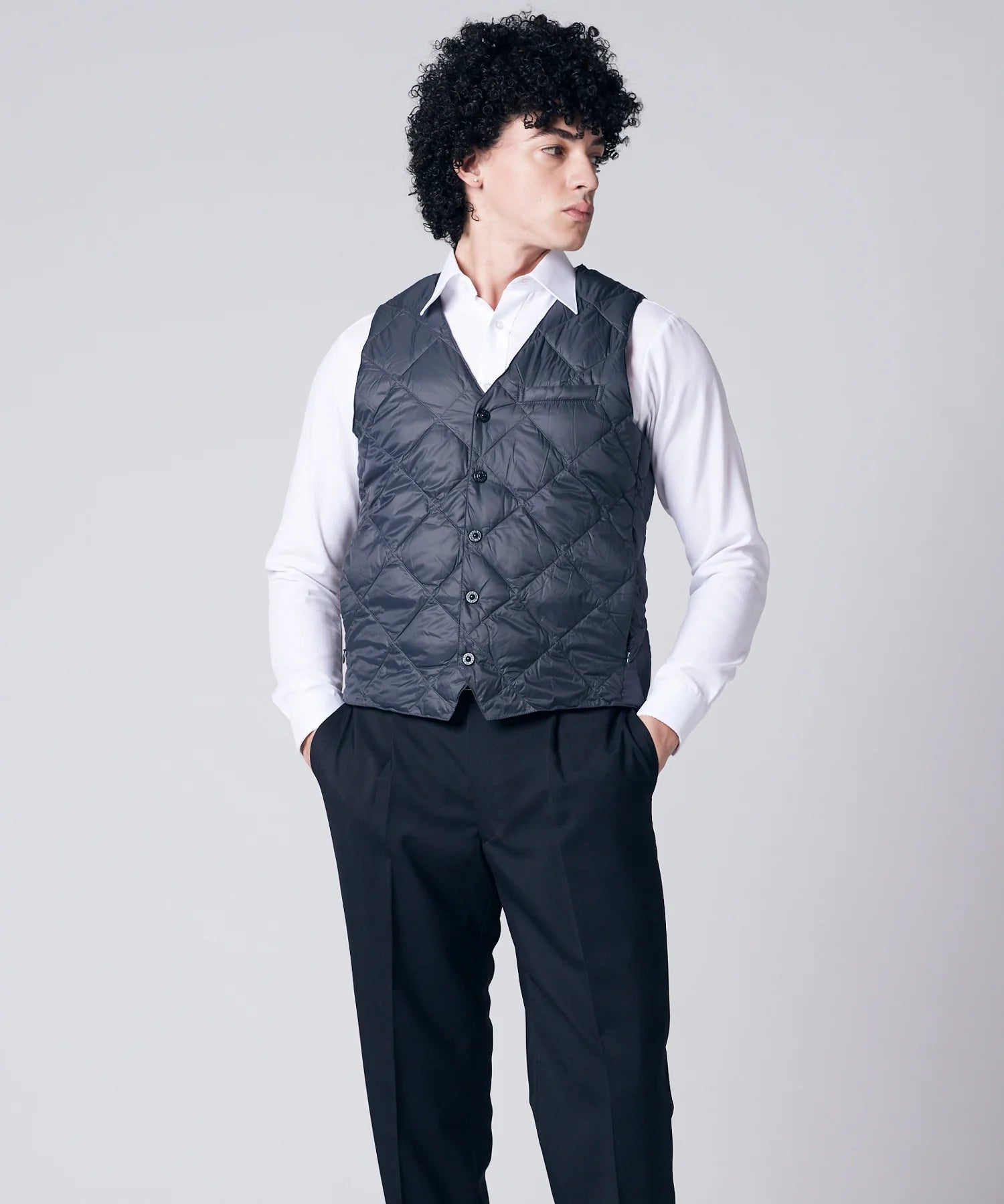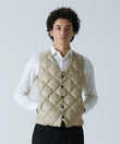 A down gilet featuring a clean front design with snap buttons for effortless wear.