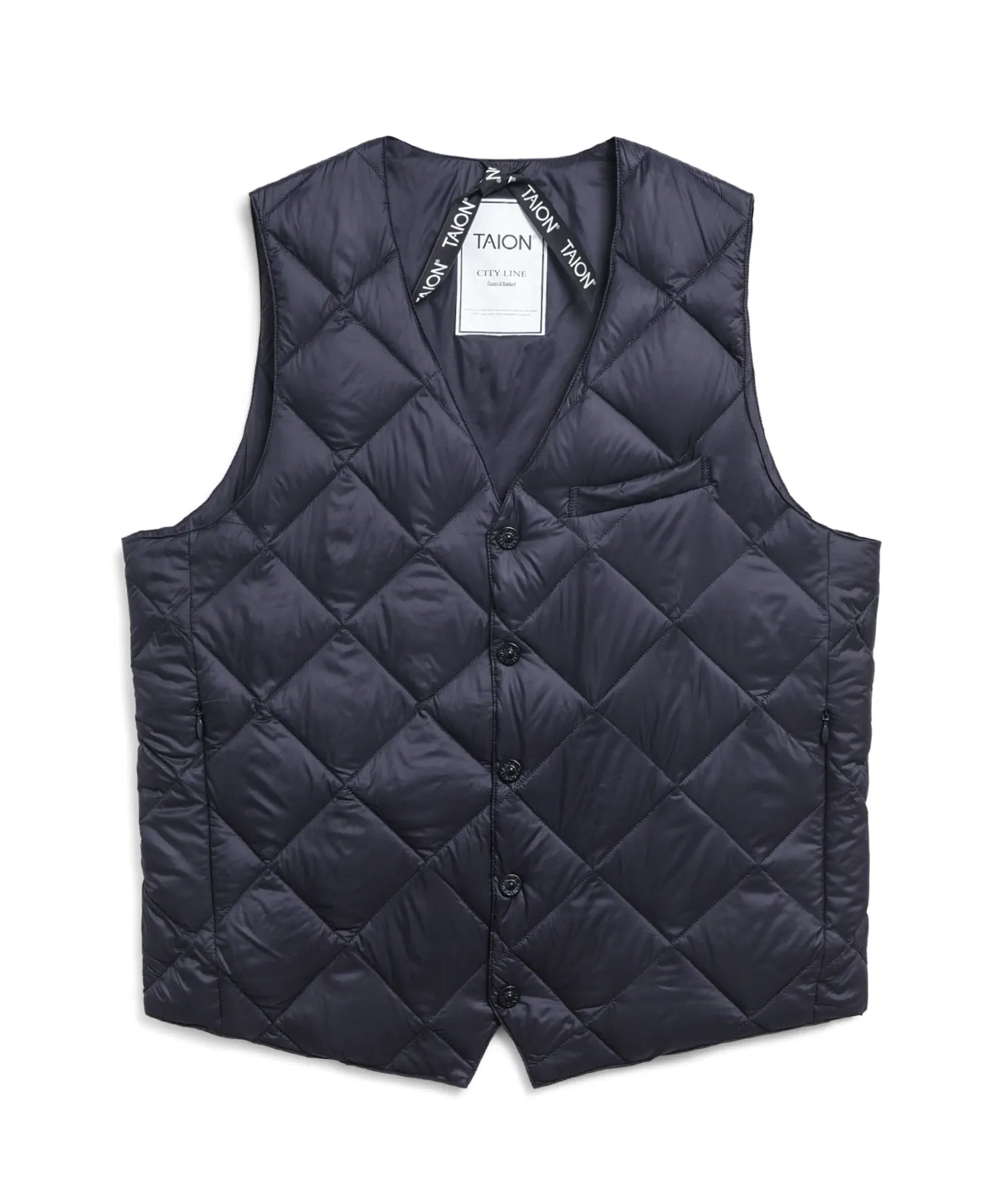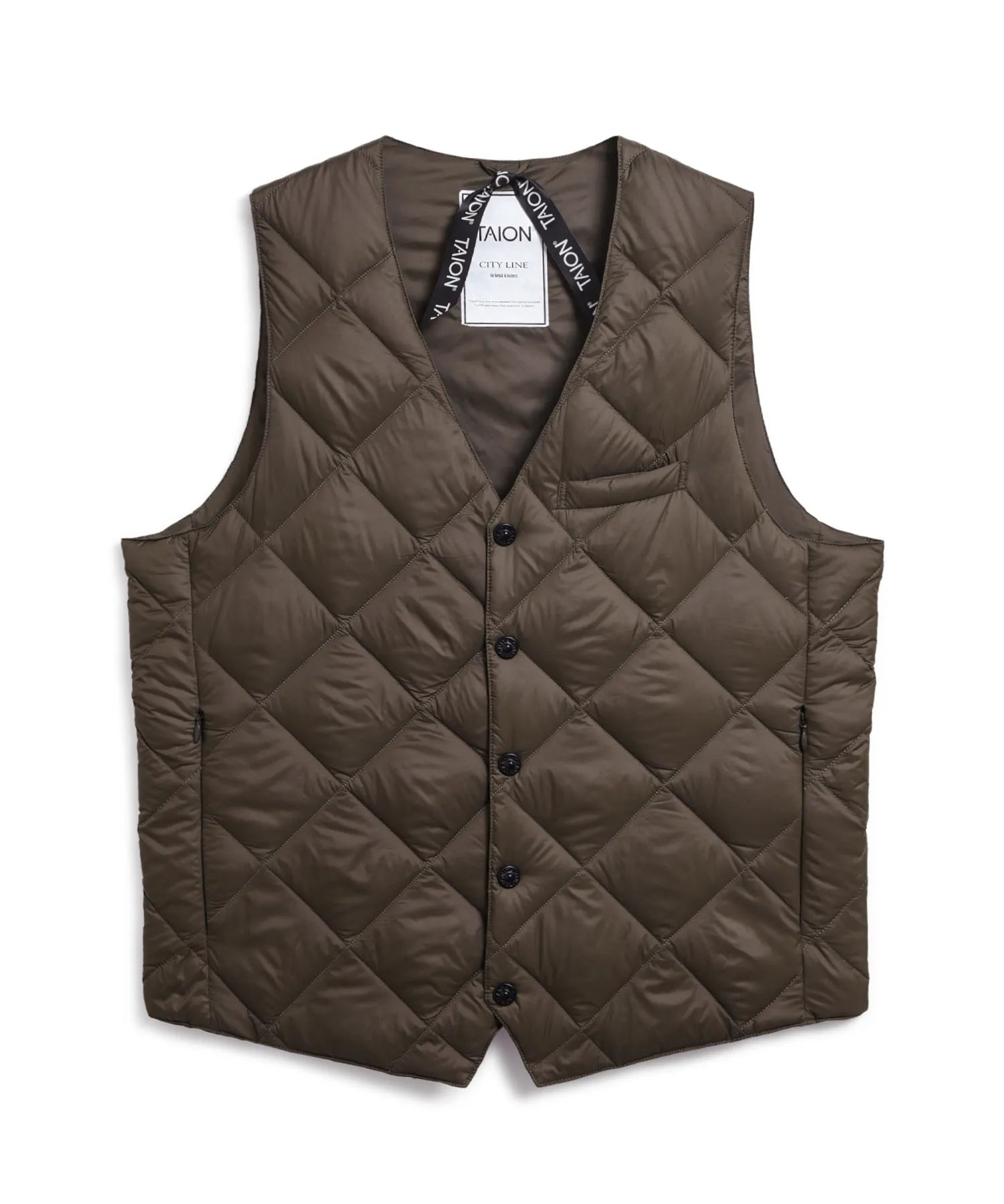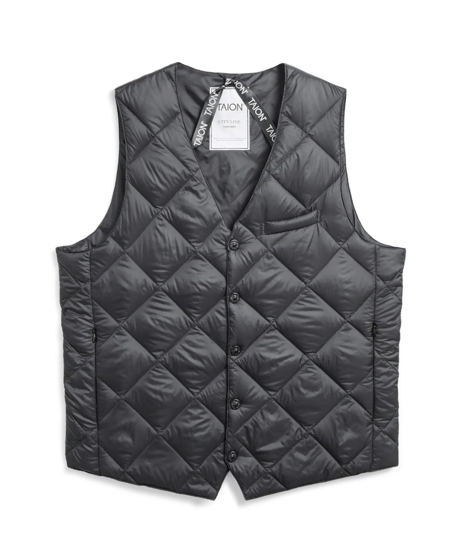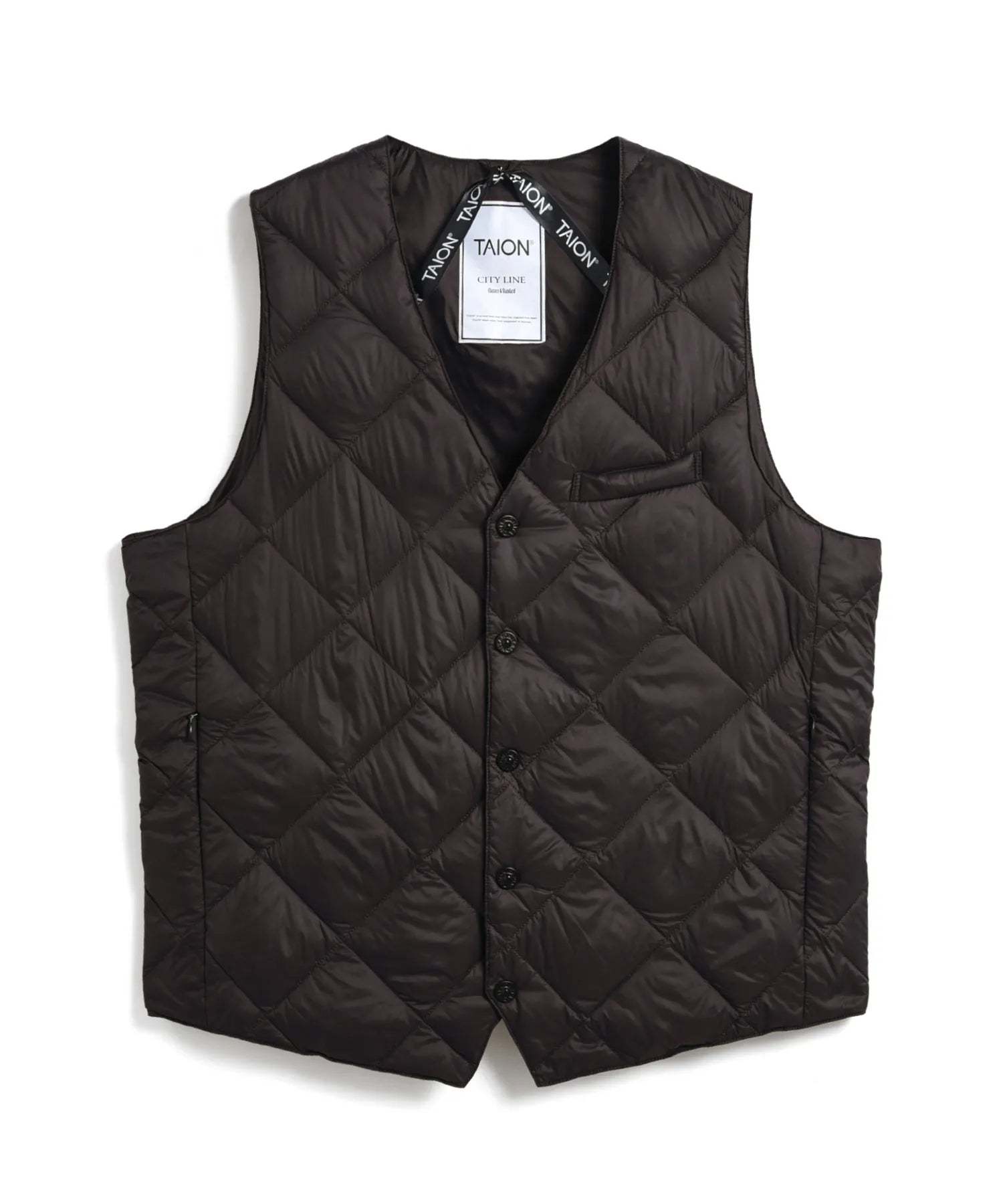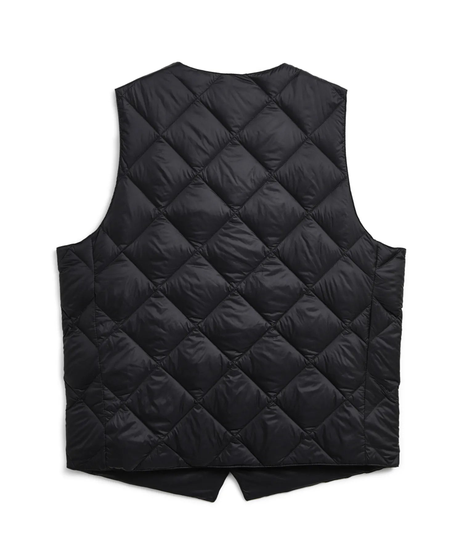 A down gilet featuring a clean front design with snap buttons for effortless wear.
