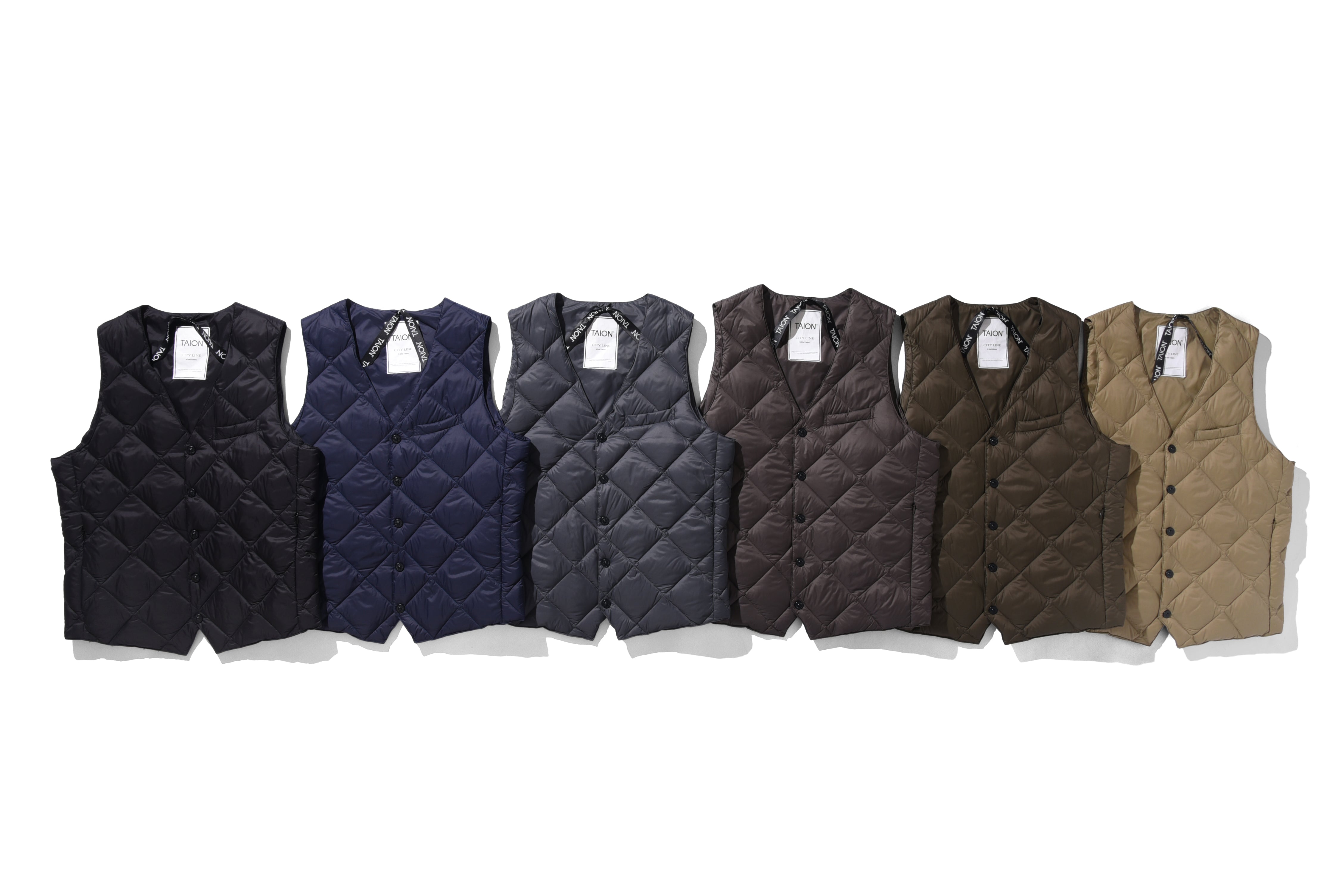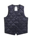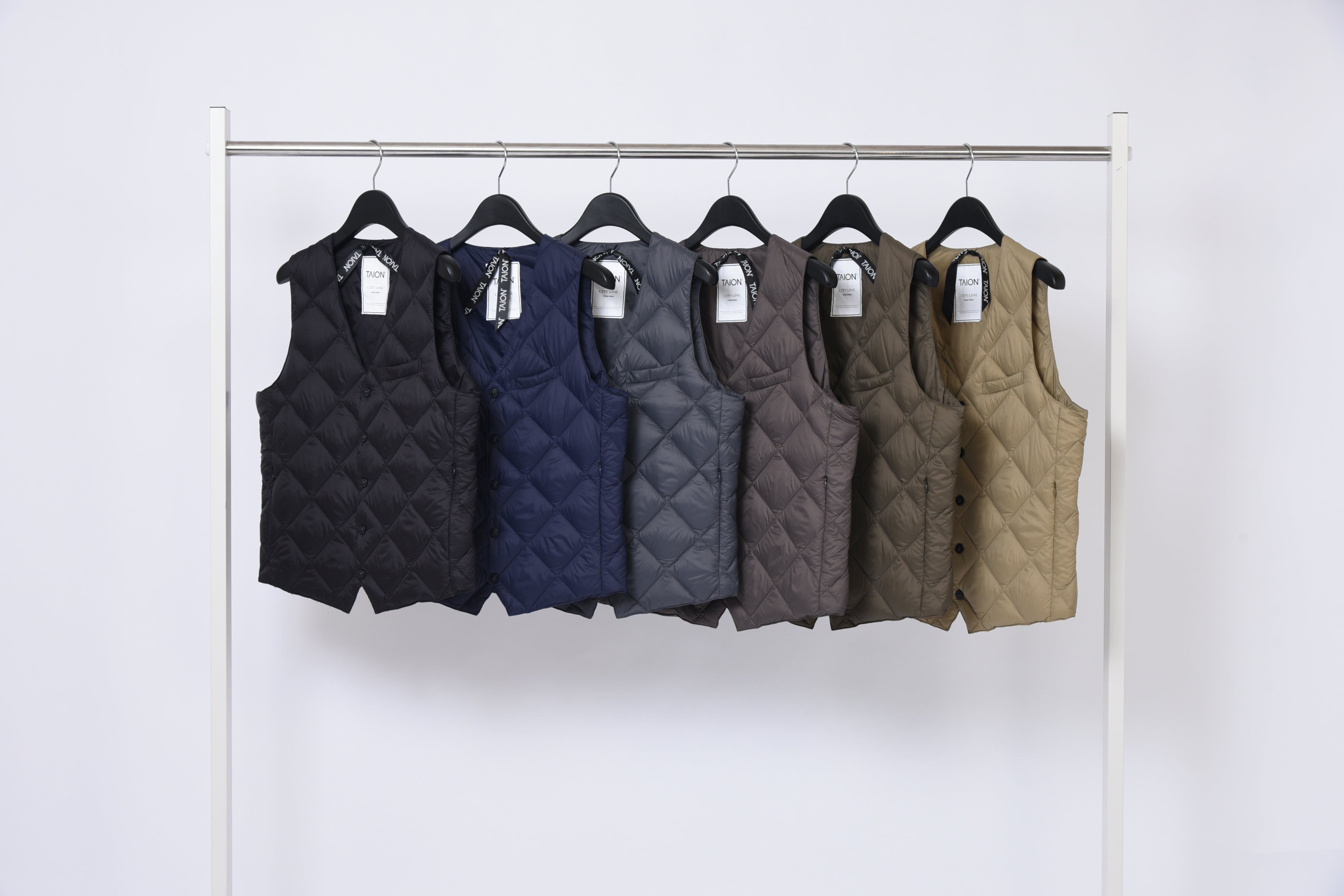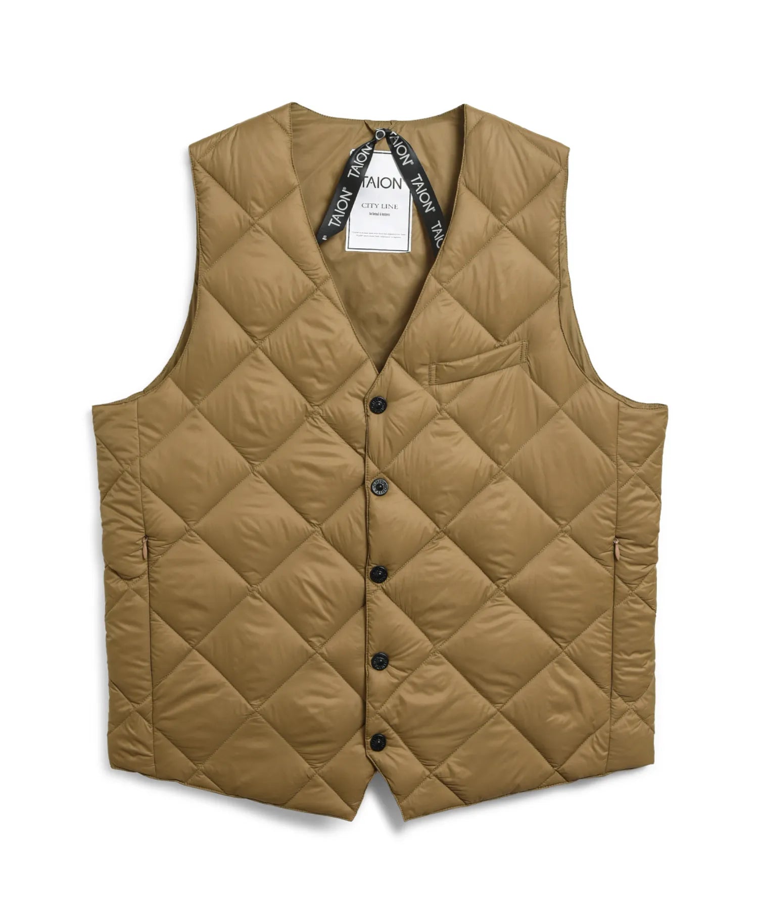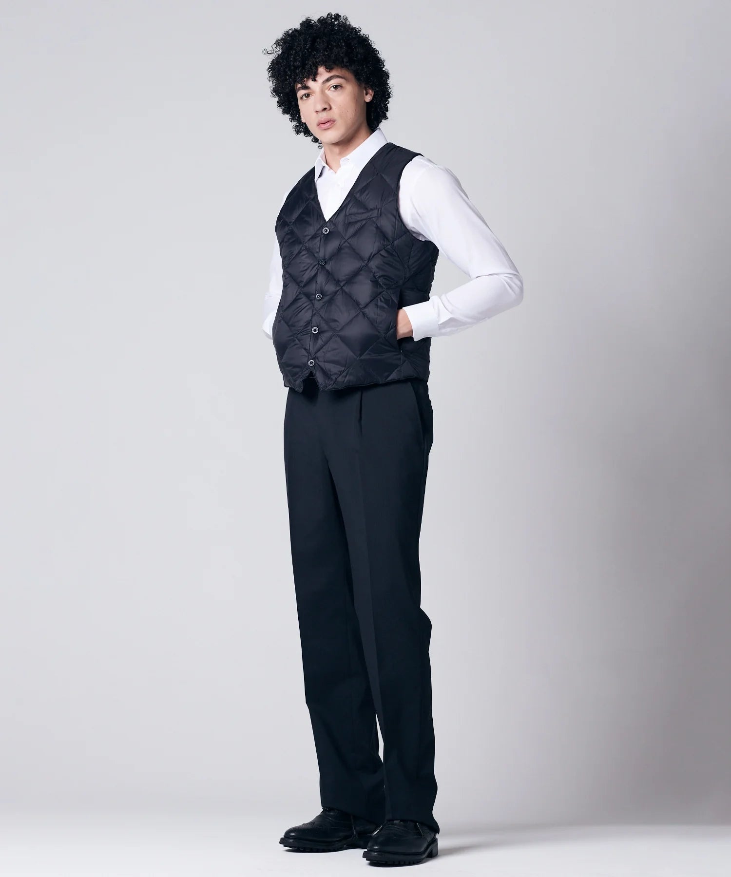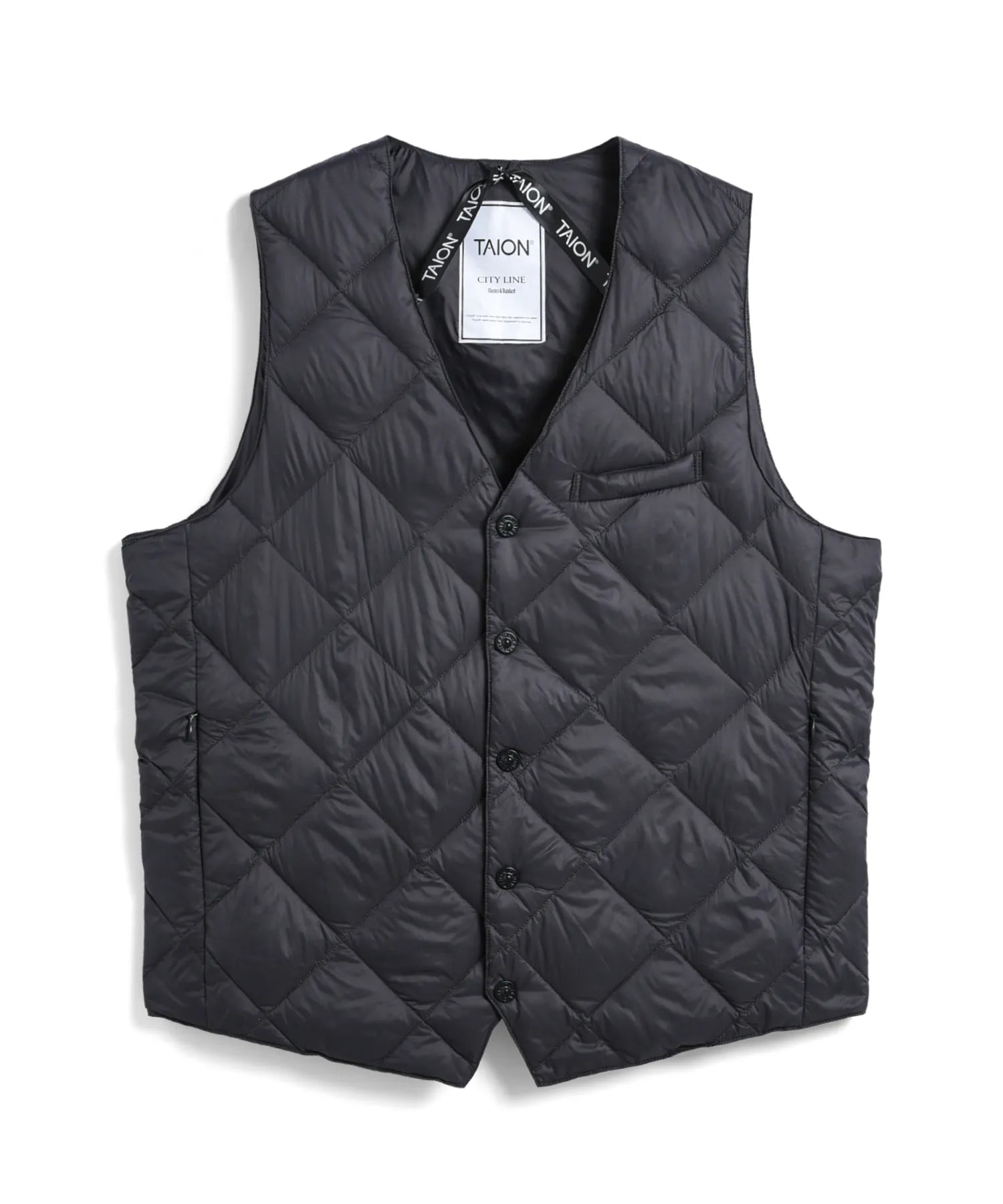 A down gilet featuring a clean front design with snap buttons for effortless wear.