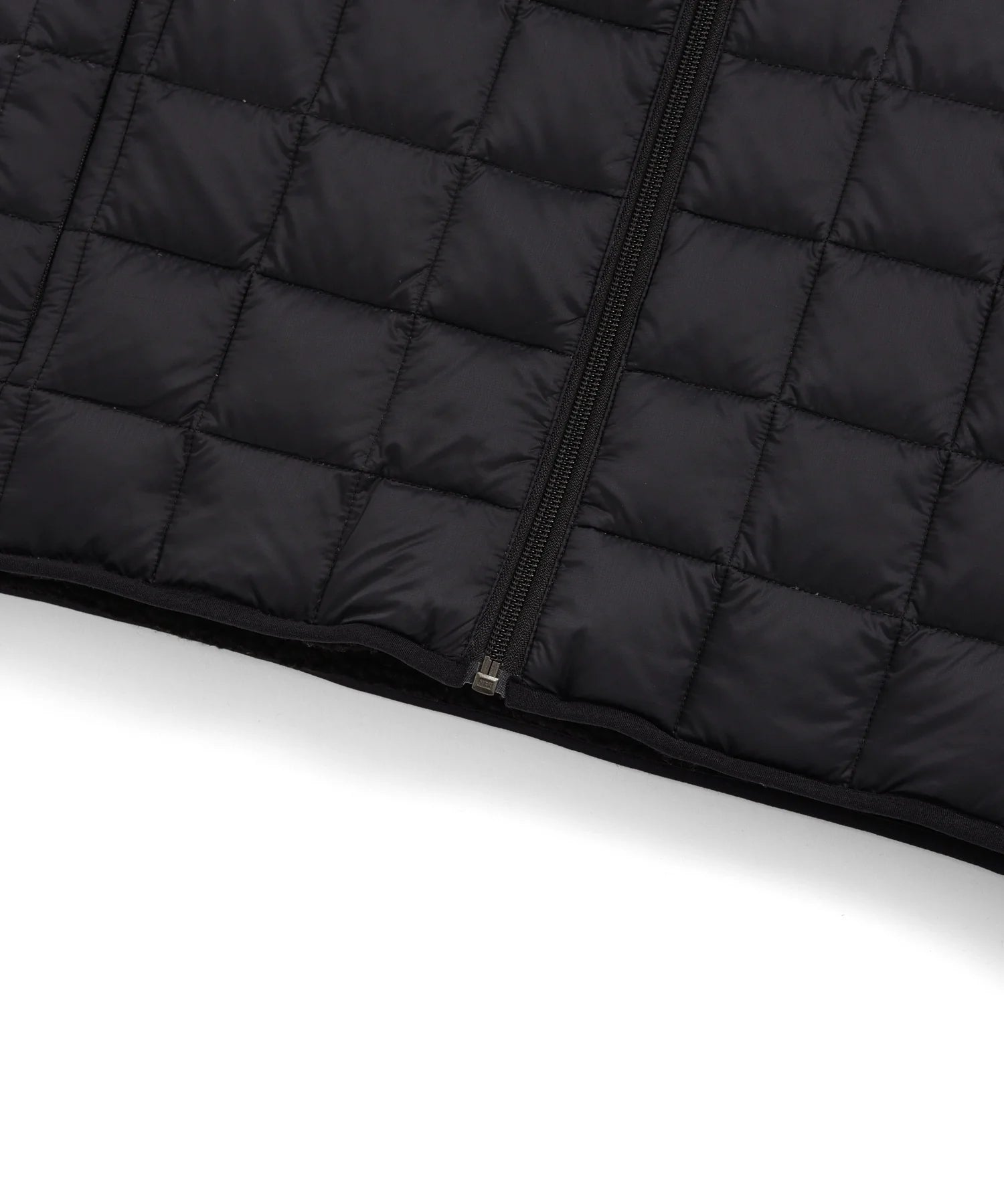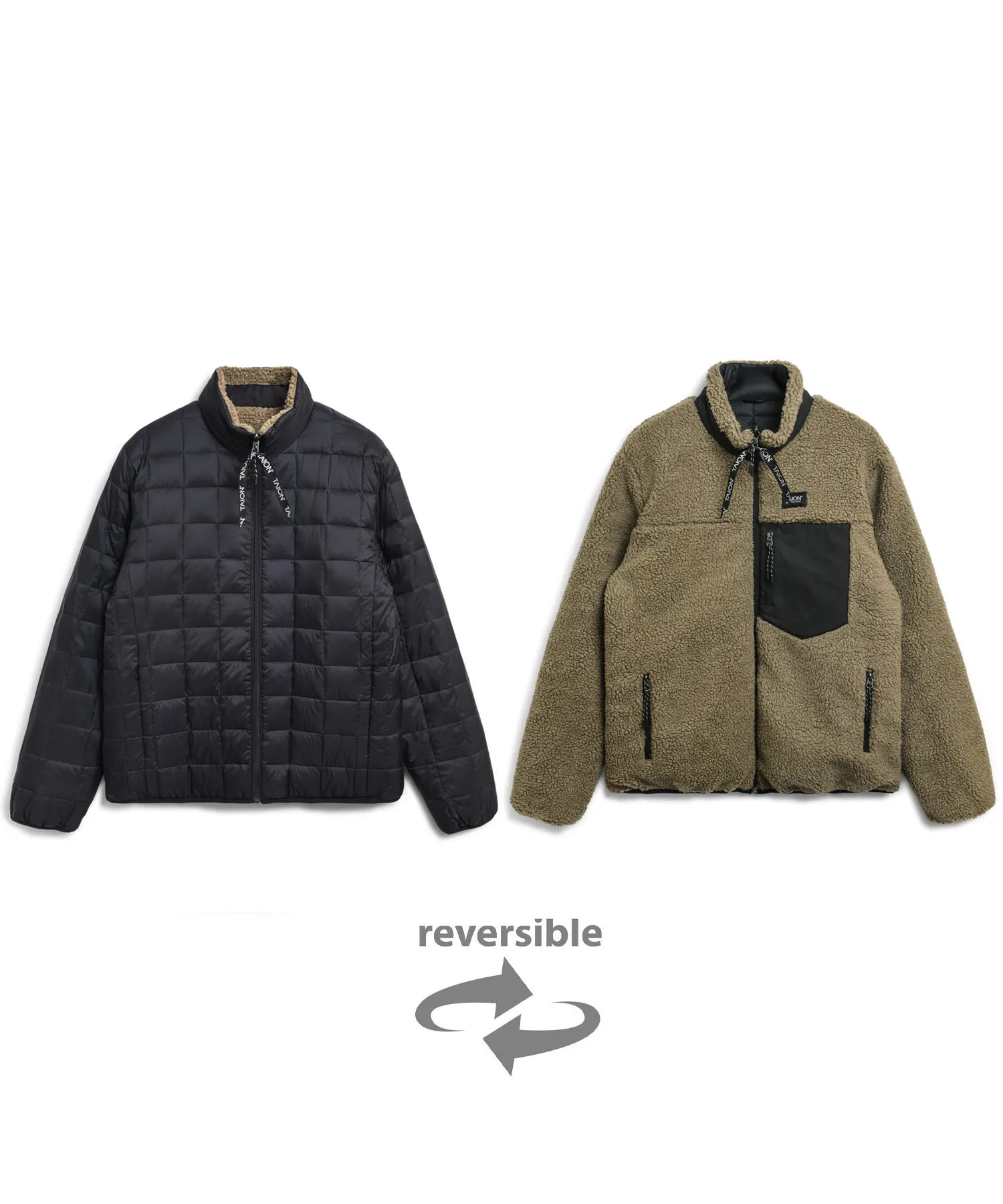 The outer side features durable nylon ripstop fabric filled with high-loft 800FP down, while the reverse side combines thick, soft boa fleece for added comfort and insulation.