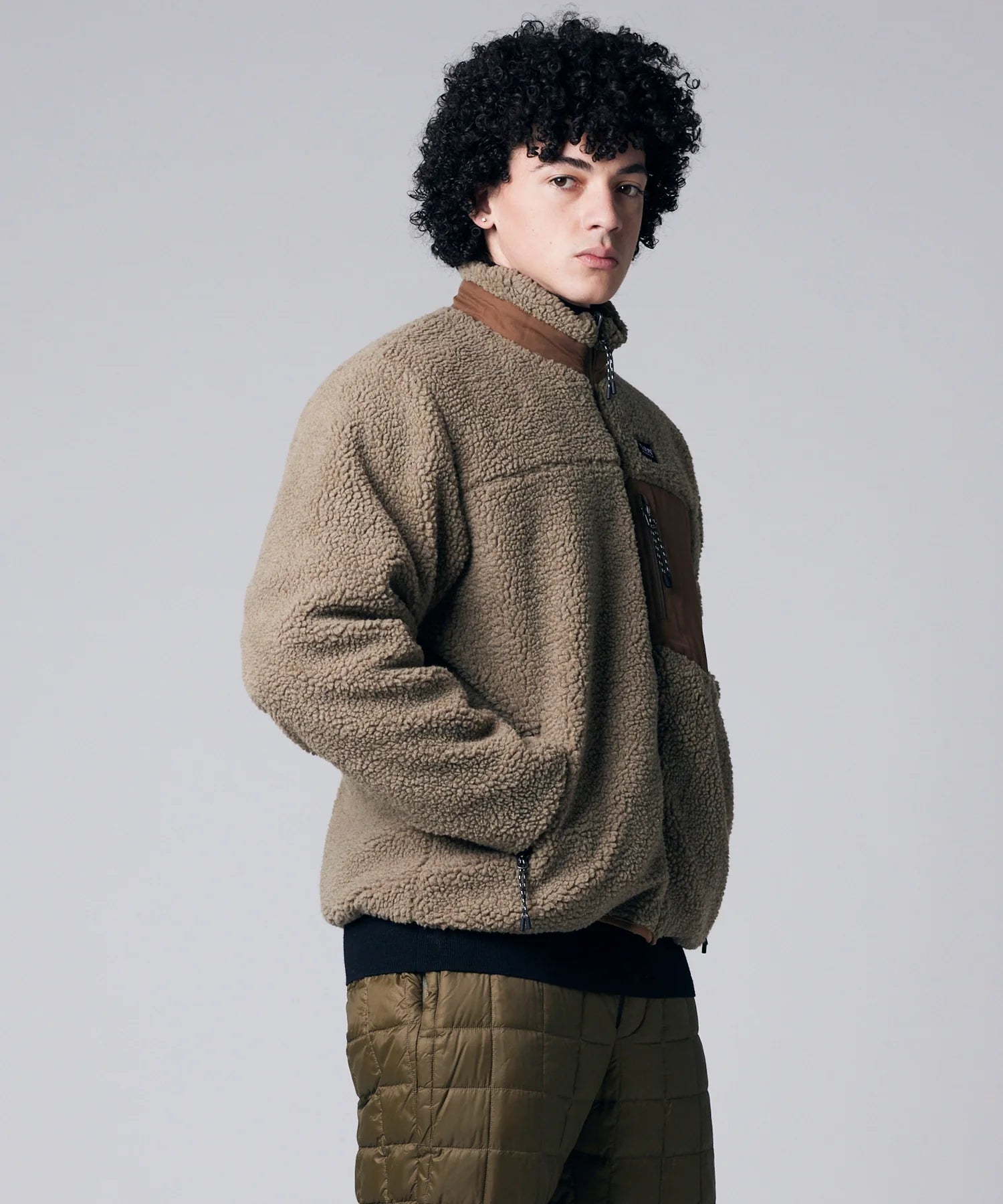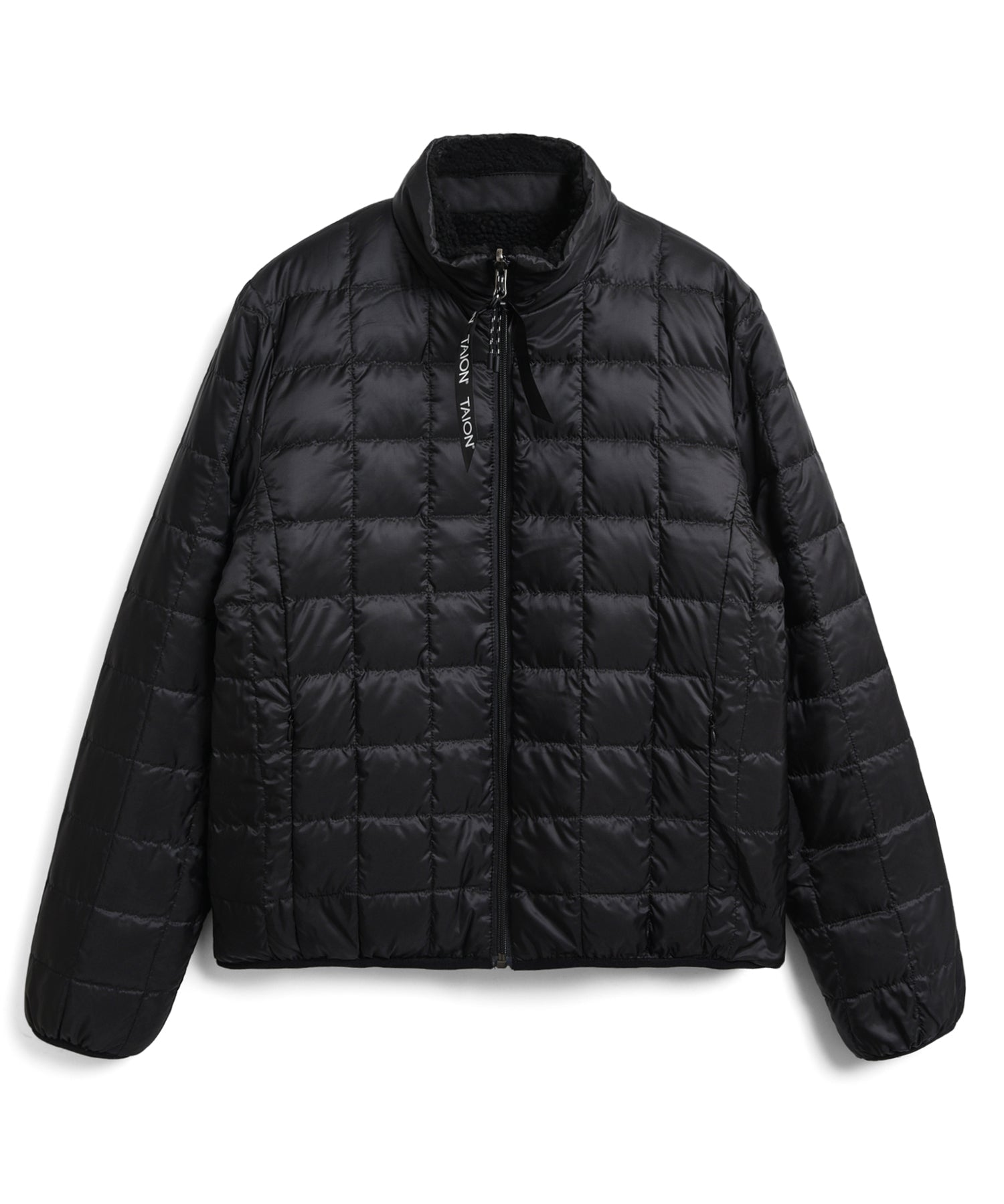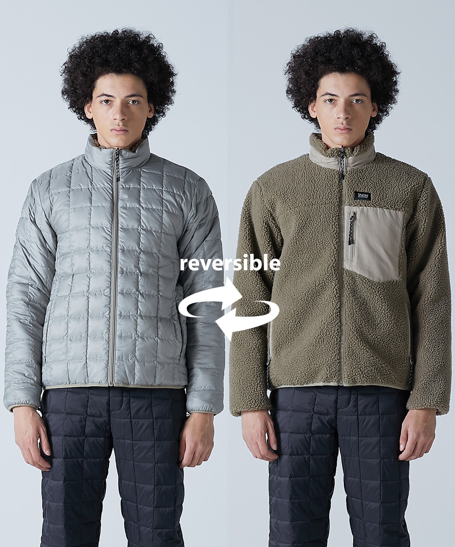 A popular piece from the MOUNTAIN LINE, this reversible “down × boa” high-neck jacket offers exceptional warmth and versatility.