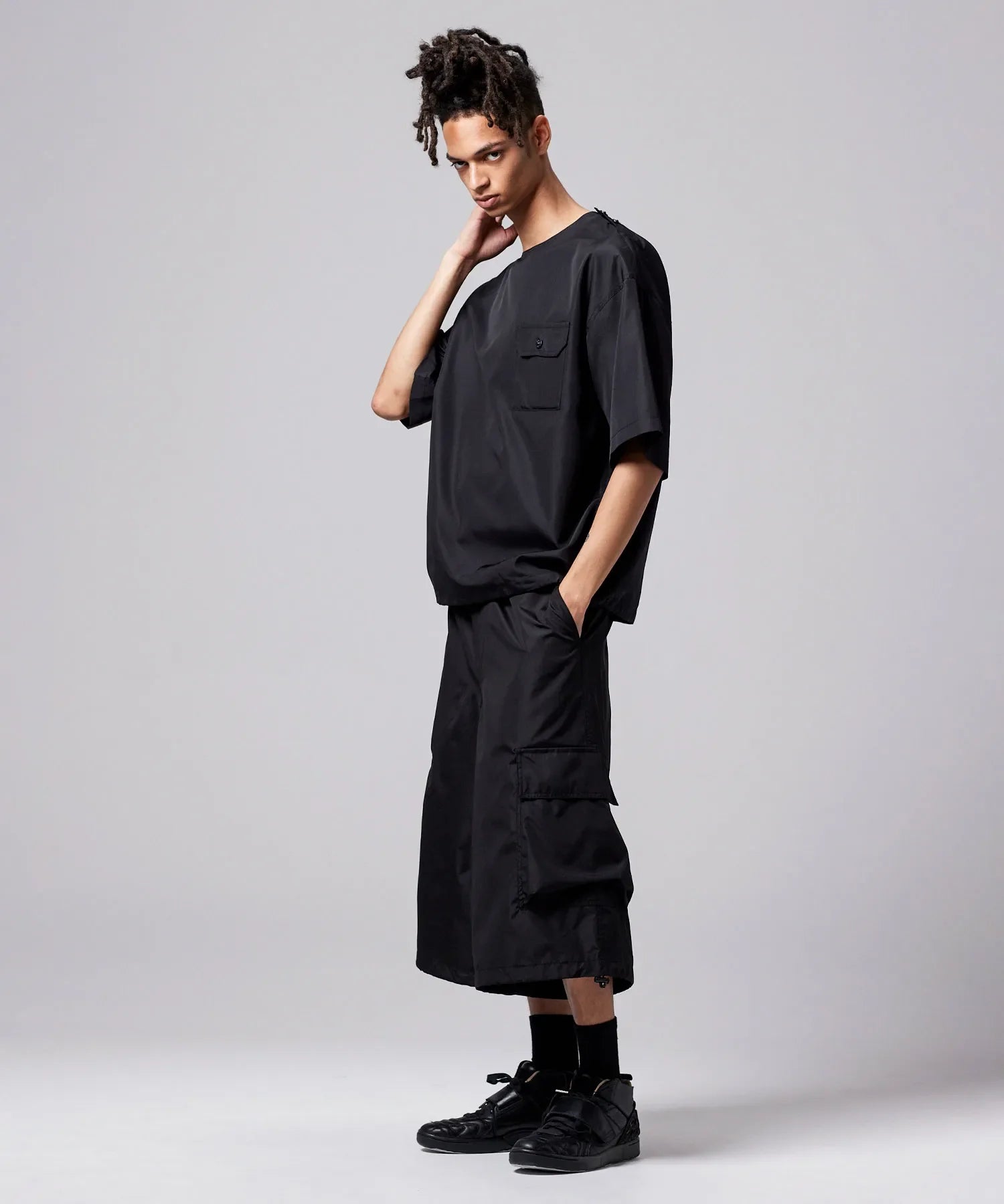 The wide silhouette and cargo pockets provide practical military-inspired detailing while creating a well-balanced look. The adjustable hem allows you to modify the silhouette, offering different styling options.